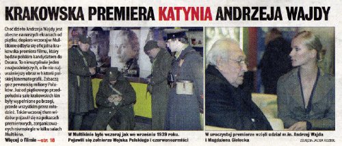 Premiera filmu Katyń w Krakowie 23.09.0723 września w krakowskim Multikinie odbył się premierowy pokaz filmu "Katyń". Uroczystość uświetnił swoją obecnością reżyser, Andrzej Wajda, oraz jedna z odtwórczyń ról głównych - Magdalena Cielecka.