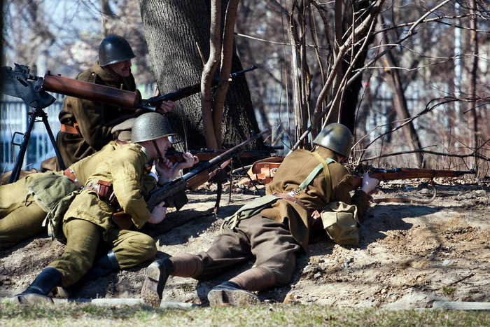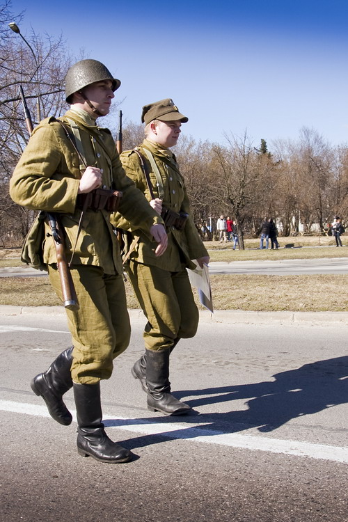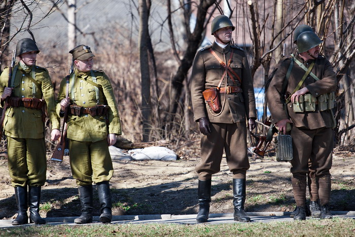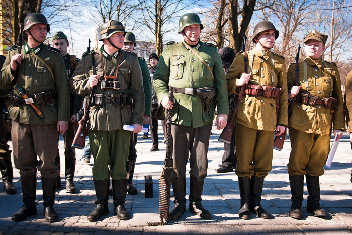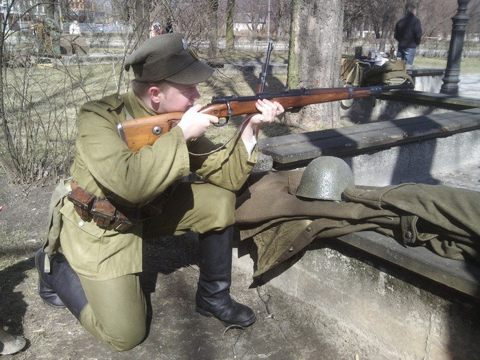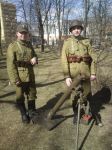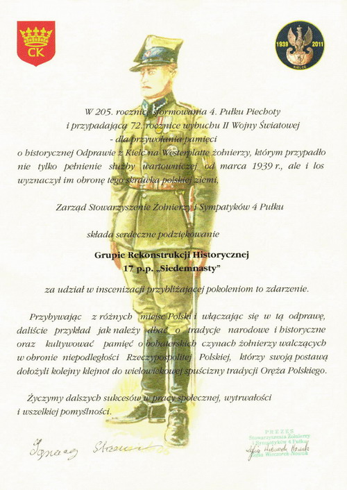 III Odprawa Kieleckiej Zmiany na Westerplatte 27.03.2011Trzeci raz przyszło nam otwierać sezon rekonstrukcyjny wcielając się w rolę Westerplatczyków, w miejscu jakże odległym od Wybrzeża stolicy województwa świętokrzyskiego, gdzie koledzy z GRH 4 PPLeg systematycznie przypominają, że to właśnie z ich miasta w marcu 1939 r. odeszła ostatnia zmiana 48 żołnierzy dowodzonych przez por. Leona Pająka w celu wzmocnienia załogi Wojskowej Składnicy Tranzytowej, polskiej enklawy na wrogim wtedy terytorium Wolnego Miasta Gdańska. Godny zwrócenia uwagi jest fakt, że organizatorzy nie pozostają przy ustalonej formule i z każdym rokiem starają się uatrakcyjnić obchody. Tym razem poza Mszą więtą, uroczystościami pod Pomnikiem Legionowej Czwórki oraz dioramami na których prezentowały się przybyłe grupy, licznie zgromadzeni widzowie mieli też możliwość uczestniczyć w inscenizacji odparcia przez Załogę mierci pierwszego niemieckiego ataku na Składnicę. Słowo uczestniczyć nie zostało tutaj użyte bezpodstawnie, gdyż teren inscenizacji nie został odgrodzony barierkami, lecz szpalerem rekonstruktorów Policji Państwowej oraz Policji Województwa ląskiego. Klimat nadmorskiej służby przybliżał widzom szum morza (tutaj akurat z głośników), a grozę niemieckiego uderzenia potęgowała świetna pirotechnika sypiąca grudami ziemi, która uruchomiła alarmy chyba we wszystkich samochodach zaparkowanych w promieniu kilkudziesięciu metrów. Siedemnastacy, którzy do Kielc przybyli w niedzielę rano, zostali skierowani wraz z przydzielonym z 4 PPLeg legionistą na placówkę Wał. Przemek, który wcielił się w rolę dowódcy placówki - kpr. Edmunda Szamlewskiego, rozkazał dokładnie rozpoznać przedpole, a także sprawdzić drogę odwrotu do Wartowni nr 1, gdzie załoga placówki miała się wycofać, jeśli zajdzie taka konieczność. Inscenizację potyczki rozpoczął miażdżący ostrzał z 280 i 150 milimetrowych dział Schleswiga, który przydusił załogę placówki do ziemi. Widząc zbliżających się Niemców, kpr. Szamlewski rozpoczął ostrzał z rkm wz.28, który jednak - zgodnie z prawdą historyczną - zaciął się po kilku strzałach. Dowódca placówki nakazuje odskok pod osłoną rzuconych granatów obronnych, które wprowadziły nieco zamieszania w szeregach nieprzyjaciela. Po wycofaniu na Wartownię nr 1 udało się usunąć zacięcie i nasz 3-osobowy oddział ponownie obsadza placówkę. Zdemoralizowani śmiercią swojego dowódcy żołnierze niemieccy, rażeni celnym ostrzałem moździerzy plut. Bieniasza, jak i zmasowanym ogniem broni maszynowej z wartowni oraz placówek Prom i Wał, rozpoczęli odwrót poza mury Składnicy. W ten sposób zakończyło się pierwsze starcie Bohaterskiej Załogi, które było początkiem 7-dniowego boju. Serdecznie dziękujemy Organizatorom za zaproszenie nas na te wspaniałe uroczystości. Stało się już chyba tradycją, że Odprawa Kieleckiej Zmiany na Westerplatte rozpoczyna sezon rekonstrukcyjny naszej grupy. Pozdrawiamy wszystkich Kolegów, z którymi wspólnie udało się stworzyć to wspaniałe widowisko. Chcemy dodatkowo serdecznie podziękować Panu Dariuszowi Barańskiemu za udostępnienie do relacji swoich zdjęć ze strony: ulotnechwile.wordpress.com [TB] Galeria zdjęć